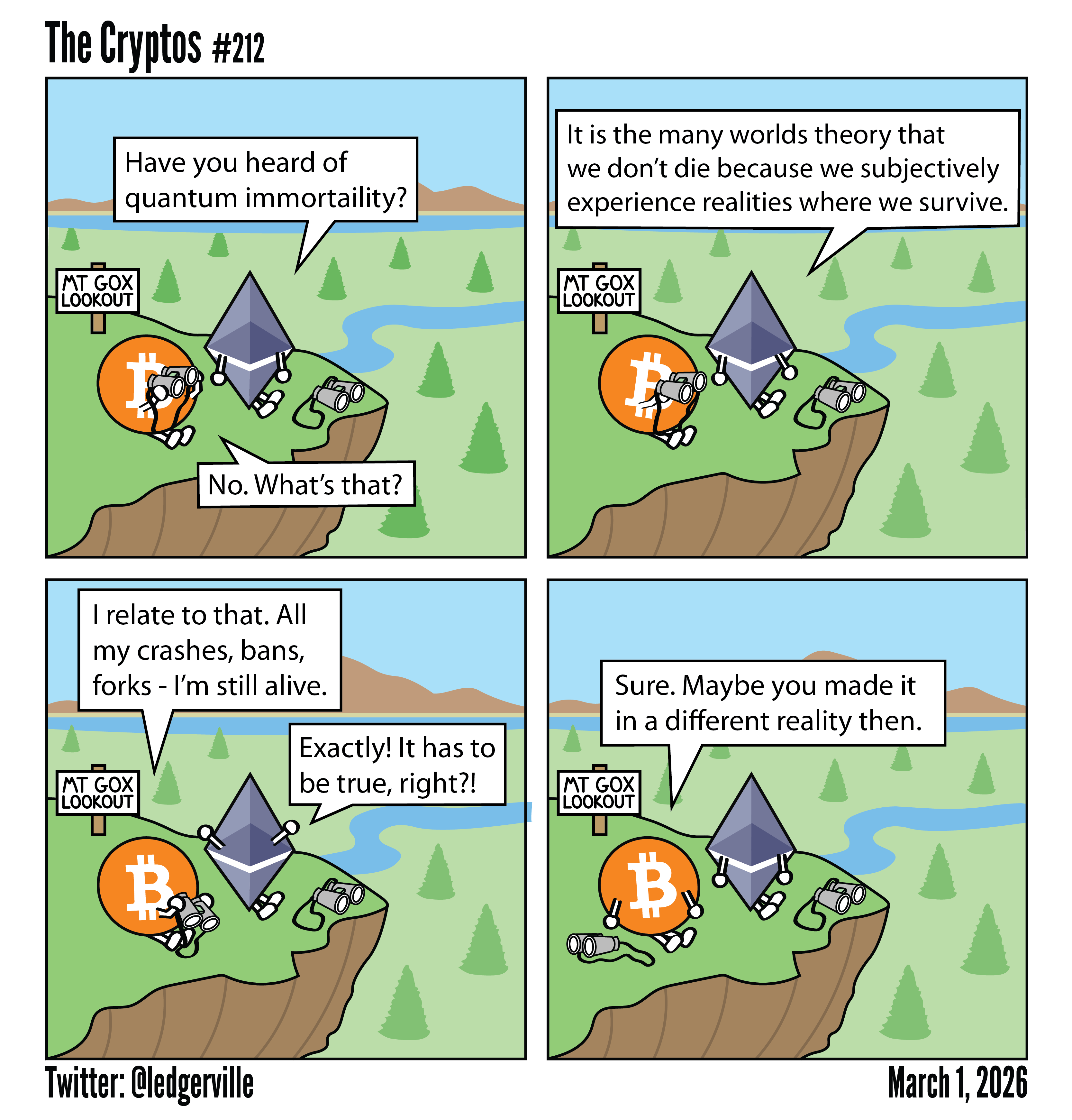 Quantum immortality to teoretyczny eksperyment myślowy, sugerujący, że świadomość może przetrwać śmierć, przenosząc się między równoległymi wszechświatami, gdzie nie następują śmiertelne wydarzenia. Koncepcja bazuje na interpretacji wieloświatowej mechaniki kwantowej (Many-Worlds), zgodnie z którą każdy wynik zdarzenia kwantowego tworzy nowy wszechświat. Mimo że idea pochodzi z prac Maxa Tegmarka oraz wcześniejszych badań Hugh Everetta, nie ma dowodów naukowych i nie rozwiązuje problemów fizycznego starzenia. Komiks przedstawia postacie Ethereum i Bitcoina rozmawiających o teorii, nawiązując do przetrwania przez liczne kryzysy.