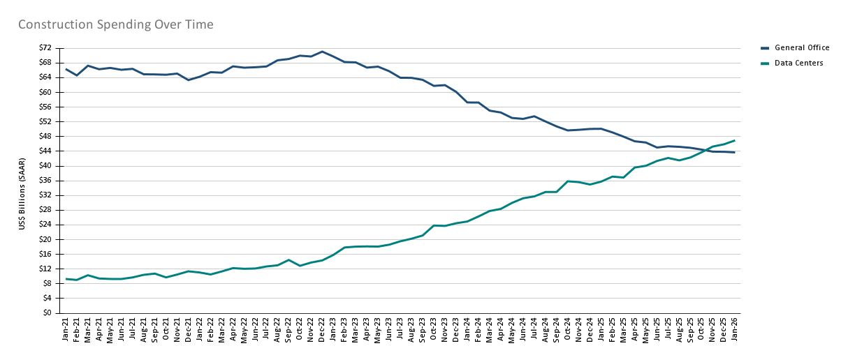 Według najnowszego raportu amerykańskiego Urzędu Statystycznego, wydatki na budowę centrów danych ponownie przewyższają wydatki na biura – różnica powiększa się. W styczniu 2026 na data center wydano 7,5% więcej niż na biura, a trend ten widoczny jest już od kilku lat. Graficzne zestawienie z raportu pokazuje rosnące znaczenie infrastruktury dla AI.