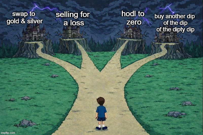 Popularny mem obrazuje rozterki inwestorów kryptowalut w obliczu trwającej wyprzedaży na rynku. Chłopiec stoi na rozdrożu czterech ścieżek: zamiana na złoto i srebro, sprzedaż ze stratą, trzymanie aż do zera (hodl) albo kupowanie kolejnego dołka dołka. To celne podsumowanie nastrojów panujących wśród inwestorów, gdy Bitcoin spadł do okolic 60–70 tys. USD, tracąc 20–30% od początku roku. Każda z opcji niesie ryzyko – ucieczka do metali szlachetnych oznacza realizację straty, hodl może pogłębić straty, a dokupowanie w spadkach jest grą va banque. Mem trafił w czuły punkt społeczności krypto, bo idealnie oddaje paraliż decyzyjny w czasach dużej zmienności rynkowej.