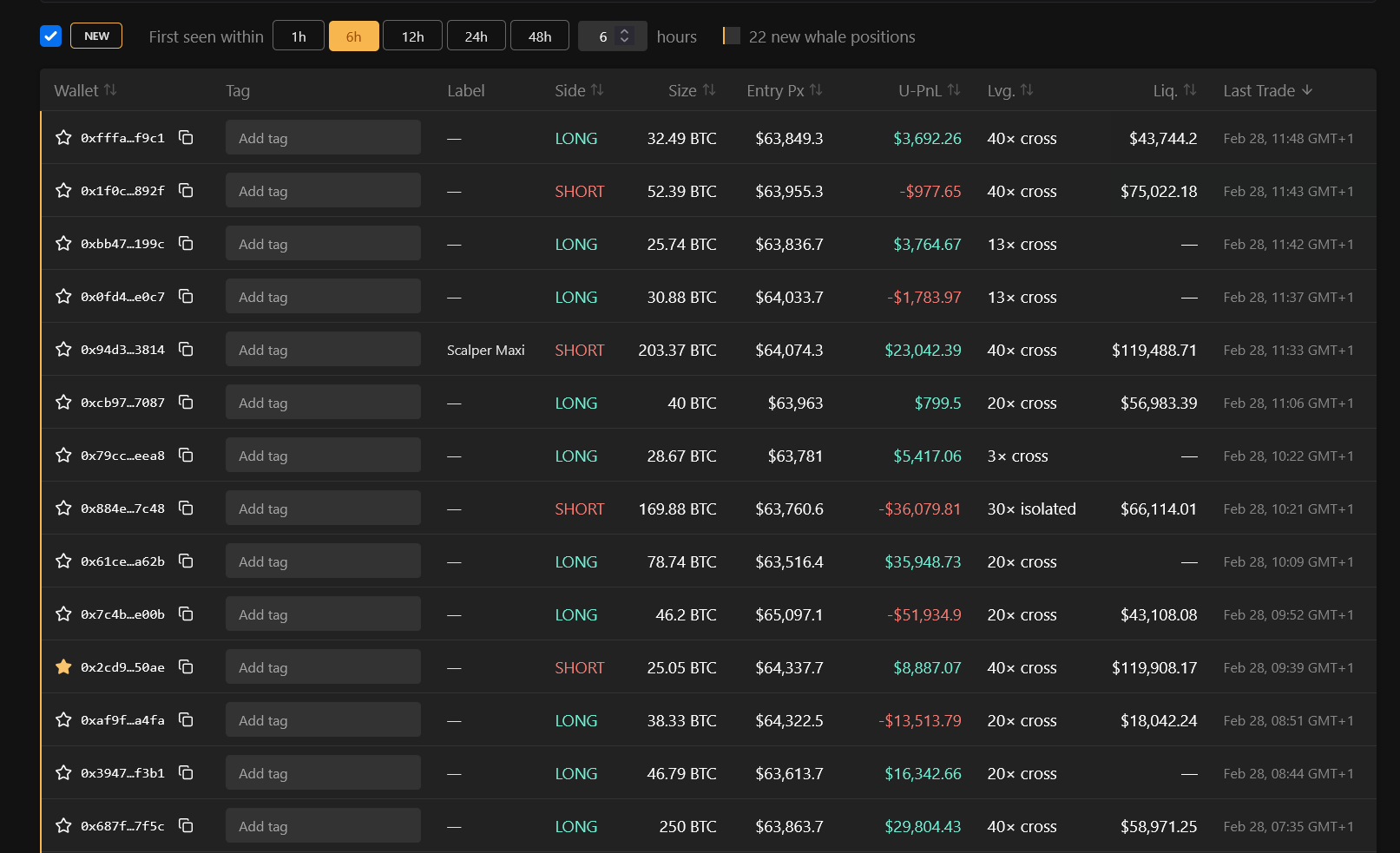 Obrazek pokazuje zestawienie najnowszych pozycji dużych graczy („whales”) na rynku krypto – większość w ciągu ostatnich sześciu godzin stawia na długie pozycje (LONG), co może wskazywać na pozytywny sentyment. Są też trzy bardzo duże shorty, lecz historia ich właścicieli wskazuje na ryzykowne, często nierentowne zachowania. Dashboard pozwala śledzić portfele, wielkości pozycji w BTC, ceny wejścia, dźwignię i potencjalne ceny likwidacji, dając obraz strategii największych traderów. Takie analizy mogą być użyteczne przy ocenie sentymentu na rynku, ale nie dają gwarancji prognozy.